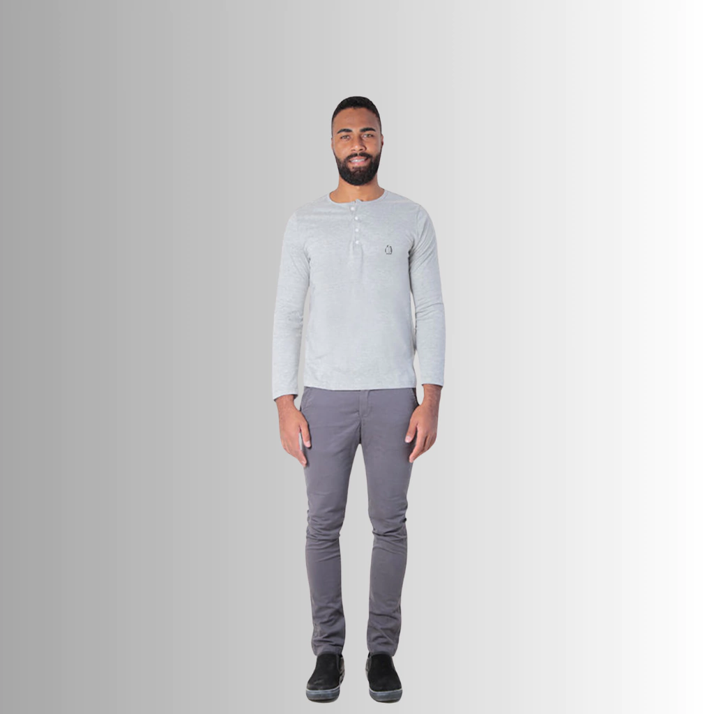 Os modelos de camiseta Henley manga longa possuem botões frontais que garantem um visual mais alinhado a uma peça casual.